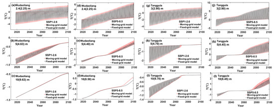 - Wudaoliang and Tanggula are in the continuous permafrost zone of the QTP. The underlying permafrost is presently in the low-temperature stage there. This is associated with minimal ground subsidence. Therefore, the improvement of the simulation performance is relatively small in the moving-mesh model considering ground subsidence during the observation period. Projections indicate that the permafrost at the two study sites will be close to the zero-gradient stage in 2030–2040 under the SSP5-8.5 scenario. By that stage, there may be a high risk of ground surface settlement and the effects of ground subsidence on permafrost simulation may be significant.