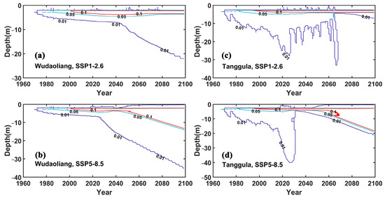 The simulation results concerning the ground subsidence and permafrost change trajectories at (a,b) Wudaoliang and (c,d) Tanggula under the SSP1-2.6 and SSP5-8.5 scenarios.