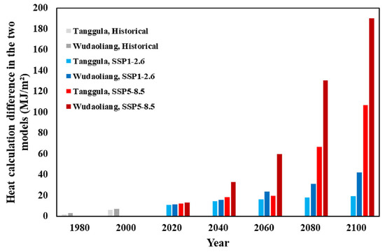 As shown in Figure 4, permafrost simulation ignoring ground subsidence will lead to a smaller original thickness of permafrost that has thawed. Compared with the fixed-mesh model, there are an extra 0.04 m3/m2 and 0.03 m3/m2 of melted ground ice at Wudaoliang and Tanggula by 2018, respectively, in the moving-mesh model. The extra melted ground ice in the moving-mesh model will reach 0.12 m3/m2 at Wudaoliang and 0.05 m3/m2 at Tanggula by 2100 under the SSP1-2.6 scenario, and reach 0.57 m3/m2 at Wudaoliang and 0.32 m3/m2 at Tanggula by 2100 under the SSP5-8.5 scenario. Therefore, the heat consumed by ground ice melting may also be underestimated in permafrost simulations without ground subsidence considerations. We performed quantitative calculations of the bias of the heat consumption for permafrost changes resulting from ground subsidence (Figure 8). The effect that error accumulation has on the calculation of heat consumption is clear even under the SSP1-2.6 scenario. The heat consumed by permafrost changes in the moving-mesh model is much larger than that in the fixed-mesh model under the SSP5-8.5 scenario. The calculated difference in heat consumption is 15.94 MJ/m2 at Wudaoliang and 11.64 MJ/m2 at Tanggula by 2018. It is 38.60 MJ/m2 at Wudaoliang and 19.43 MJ/m2 at Tanggula by 2100 under the SSP1-2.6 scenario. It is 190.23 MJ/m2 at Wudaoliang and 106.94 MJ/m2 at Tanggula by 2100 under the SSP5-8.5 scenario.