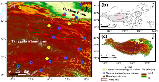 Study area map depicting (a) The distribution of observation stations in the study area. (b) The boundary of the TP, and (c) Digital elevation (in m) map of the TP.