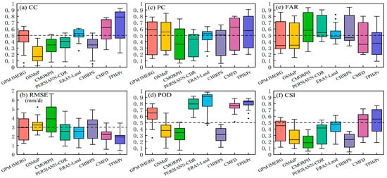 The performances of eight precipitation products in terms of (a) CC, (b) RMSE, (c) PC (d) POD (e) FAR (f) CSI (Horizontal dashed lines are the medium scores) at daily scale.