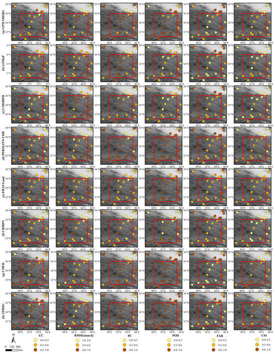 The spatial distribution of performances in terms of CC (the first column), RMSE (the second column), PC (the third column), POD (the fourth column), FAR (the fifth column), and CSI (the sixth column) estimated by GPM IMERG (the first row), GSMaP (the second row), CMORPH (the third row), PERSIANN-CDR (the fourth row), ERA5-Land (the fifth row), CHIRPS (the sixth row), CMFD (the seventh row), and TPHiPr (the eighth row) at the daily scale over the hinterland of the TP.
