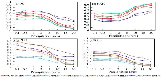 In order to further refine the performance of each precipitation product in different precipitation intensities, 0.5, 1, 2, 5, 10, 15, and 20 mm/d are selected as the precipitation threshold to calculate the PC, POD, FAR, and CSI.