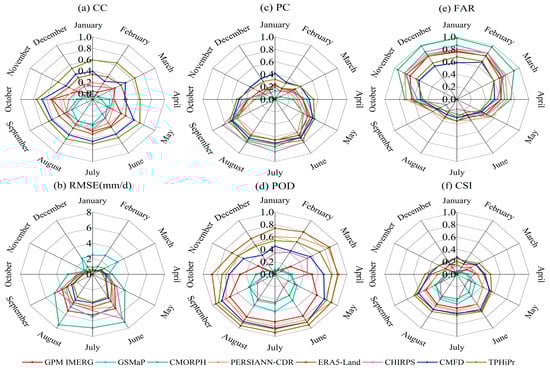 The performances of eight precipitation products in terms of (a) CC, (b) RMSE, (c) PC (d) POD (e) FAR (f) CSI at monthly scale.