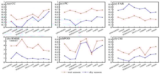 The performances of eight precipitation products in terms of (a) CC, (b) RMSE, (c) PC (d) POD (e) FAR (f) CSI in wet and dry seasonal scale.