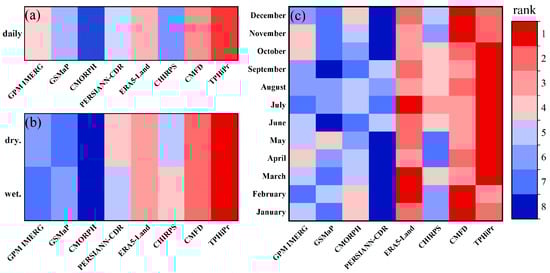 Brunke’s comprehensive ranking of eight precipitation products at (a) daily scale, (b) wet and dry seasonal scale, and (c) monthly scale.
