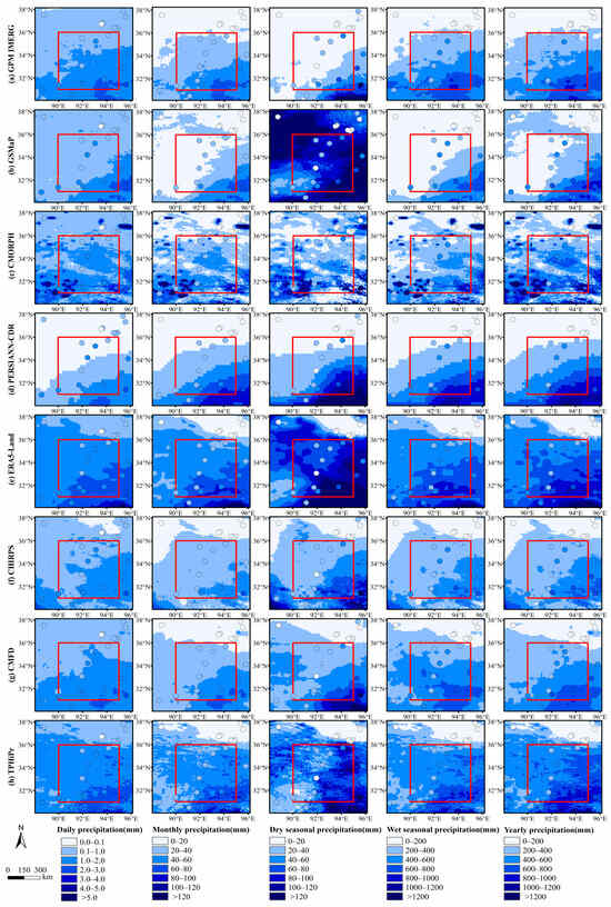 Publicly available datasets were analyzed in this study. The precipitation datasets used in our work can be freely accessed at the following websites: GPM IMERG: https://disc.gsfc.nasa.gov/datasets/GPM_3IMERGHH_06/summary (accessed on 12 October 2022); GSMaP:https://sharaku.eorc.jaxa.jp/GSMaP/index.htm (accessed on 11 November 2022); CMORPH: https://www.ncei.noaa.gov/products/climate-data-records/precipitation-cmorph (accessed on 20 October 2022); PERSIANN-CDR: http://chrsdata.eng.uci.edu/climate-data/ (accessed on 3 November 2022); ERA5-Land: https://cds.climate.copernicus.eu/ (accessed on 3 December 2022); CHIRPS: https://www.chc.ucsb.edu/data/chirps (accessed on 13 December 2022); CMFD: https://data.tpdc.ac.cn/en/data/8028b944-daaa-4511-8769-965612652c49 (accessed on 23 November 2022); TPHiPr: https://data.tpdc.ac.cn/zh-hans/data/e45be858-bcb2-4fea-bd10-5c2662cb34a5 (accessed on 20 December 2022).