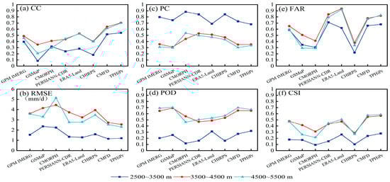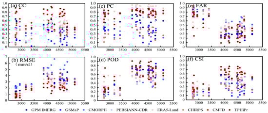 The change of eight precipitation products in terms of (a) CC, (b) RMSE, (c) PC (d) POD (e) FAR (f) CSI by elevation.