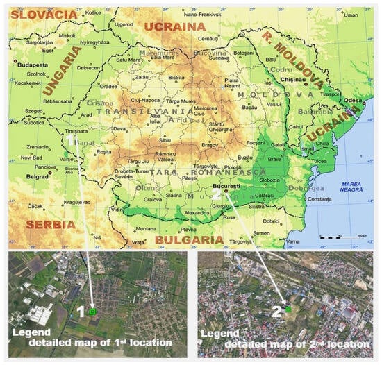 Location of sampling points on Romania map and detailed maps according to google map: Timisoara (1), Bucharest (2); GPS location of monitoring points: Timisoara (45°41′53.41″ N; 21°12′30.33″ E) and Bucharest (44°28′23.12″ N; 26°0′43.05″ E), Romania.