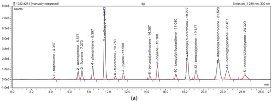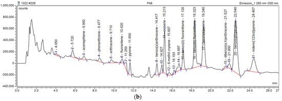 PAHs were extracted from the particulate matters deposited on the filters by liquid–solid extraction with acetone and petroleum ether. The extract was concentrated and interfering compounds were removed by purification with aluminum oxide. The purified eluate was concentrated and taken up with acetonitrile. For the separation and quantification of the analytes, the Ultimate 3000 UHPLC-FLD chromatograph (Thermo Electron, Germering, Germany) and the Hypersyl Green PAH column (Thermo Electron, Germering, Germany) (250 mm × 3 mm, 5 µm) were used. The mobile phase used was a gradient of acetonitrile (A) and ultrapure water with a flow rate of 0.9 mL/min as follows: 0–3 min isocratic elution 60% solvent A, 3–15 min gradient elution 60–100% A, 15–27 min isocratic elution 100%. In 27 min, all the analytes of interest were separated. An injection volume of 10 µL was used and the temperature set in the column thermostat was 20 °C. The program of the excitation and emission wavelengths at which the fluorescence detector signals were recorded and the chromatograms of the environmental samples can be seen in Table 1.