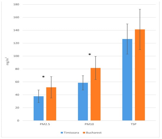 The amounts of PM2.5, PM10, and TSP particulate matters (n = 20, mean value ± SD, SD = standard deviation) from animal husbandry (Timisoara) and bakery (Bucharest), *, p < 0.5.