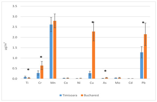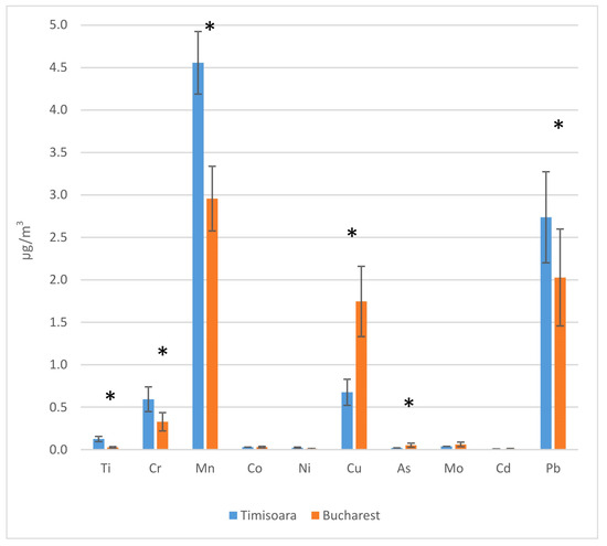 The amounts of metals found in PM10 particulate matters (n = 20, mean value ± SD) from husbandry (Timisoara) and bakery (Bucharest). *, p < 0.5.
