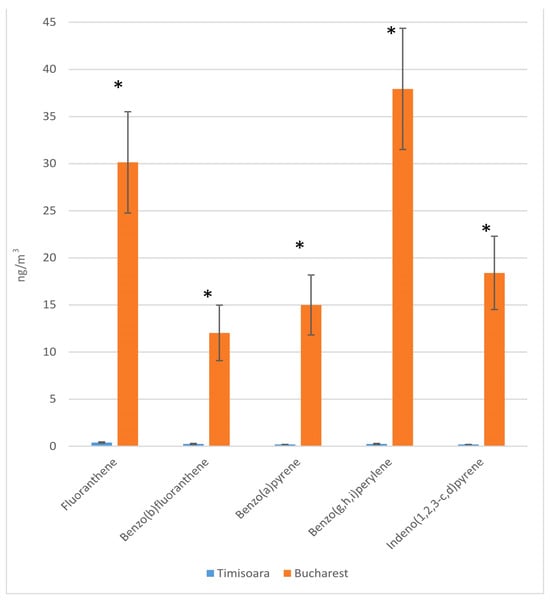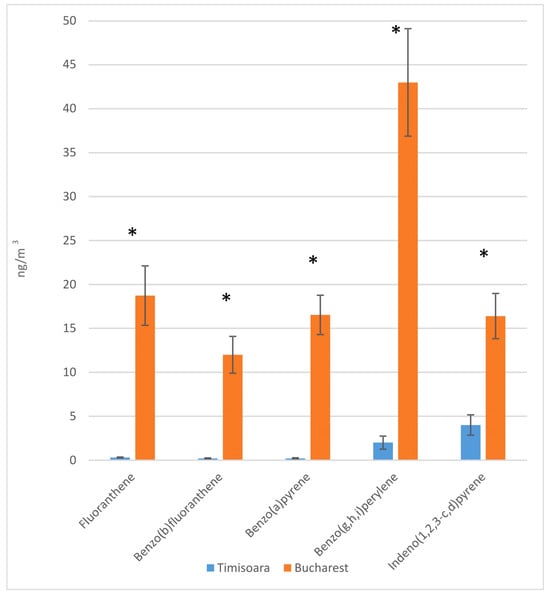 The amounts PAHs found in PM10 particulate matters (n = 20, mean value ± SD) from husbandry (Timisoara) and bakery (Bucharest). *, p < 0.5.