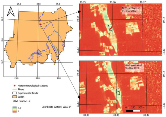 The location of the experimental field of wheat grown under irrigation in Dongola, Sudan, shown on Sentinel-2 satellite-based Normalized Difference Vegetation Index (NDVI) maps acquired on 1 March in 2022 and 2023.