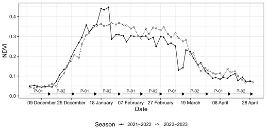 Seasonal changes in Sentinel-2 satellite-based NDVI values of the irrigated wheat field in Dongola, Sudan, in the 2021–2022 and 2022–2023 growing seasons.