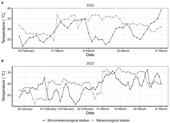 Seasonal changes in daily maximum temperature between the micrometeorological station (2 m height) in the irrigated wheat field and the nearby Dongola meteorological station in the (A) 2021–2022 and (B) 2022–2023 seasons.