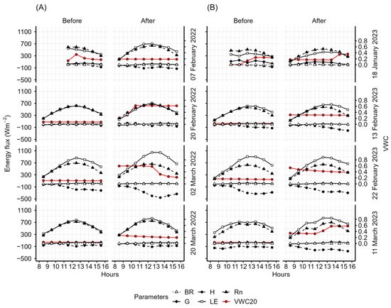 Daytime (hours 8 to 15) changes in the Bowen ratio (BR), energy balance components (net radiation (Rn), latent heat flux (LE), sensible heat flux (H), and soil heat flux (G)), and soil moisture content averaged over depths of 0.1 m to 0.2 m (VWC20) on the days before and after irrigation in the wheat field in Dongola, Sudan, in the (A) 2021–2022 and (B) 2022–2023 growing seasons. The irrigation dates are shown to the right of the panels.
