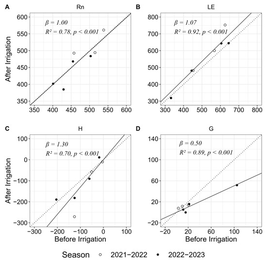 Relationships between the energy balance components averaged over hours 8–15 on the days before and after irrigation in the wheat field in Dongola, Sudan: (A) net radiation (Rn), (B) latent heat (LE), (C) sensible heat (H) and (D) soil heat (G). The linear regression analyses used the combined data of the 2021–2022 and 2022–2023 seasons, but the irrigation on 7 February 2022 was excluded because no data were available for hours 8–10 before irrigation.