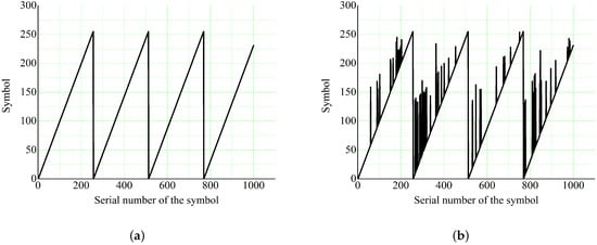 The communication channel was tested for symbol packages as illustrated in Figure 3. When symbols are transmitted without error, the image of the test object is similar to that shown in Figure 3a. The presence of such a test object on the laptop monitor indicates that there is no influence of external interfering sources or the atmospheric environment on the communication channel. Figure 3b exemplifies a significant impact of interfering sources on the transmitted signal. In the experiments, = 0.1 was considered as a limit, at which the communications is stable.