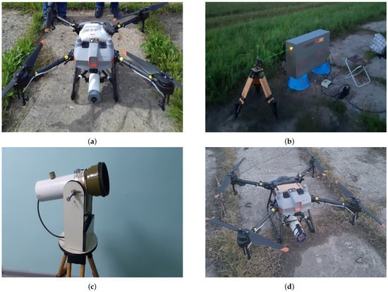 The receiving system in experimental series 1 and 2 (Figure 4c) comprised a lens refractor, a semrock brightline fluorescence bandpass filter 442/42 (IDEX Health and Science, Kawaguchi, Janpan), a UFK-4G-2 PMT (KATOD, Moscow, Russian Federation), a signal decoding device, batteries, and a laptop. In experimental series 3, we used the semrock brightline fluorescence filter FF03-510/20-25 (IDEX Health and Science, Kawaguchi, Janpan) as a bandpass filter. The receiving system in series 2 and 3 (Figure 4d) was mounted on the UAV, while in series 1, it was mounted on a tripod for stable placement on the ground.