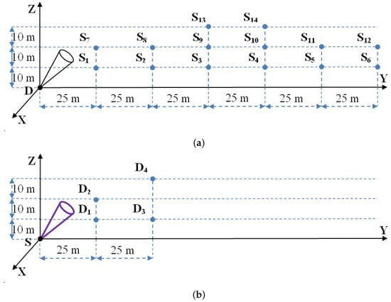 The field studies were carried out in the following way. In experimental series 1 (Figure 5a), the source S was set on the UAV and oriented at a zenith angle of 88 in accordance with the height difference at the test site. The UAV was raised to a height of 10 to 30 m depending on the experiment. The receiving system was located on the ground at a baseline distance of 25 to 150 m from the UAV. The baseline distance is the separation between the projections of the transmitting and receiving systems on the ground. The optical axis of the receiving system was oriented at a zenith angle of 45 in the direction of the source. In experimental series 2 (Figure 5b), a transmitting system similar to that in series 1 was set on the ground. The optical axis of the source was oriented at a zenith angle of 45. The receiving system was set on the UAV. The optical axis of the receiving system was oriented at a zenith angle of 88 from the vertical. The UAV with the receiving system was raised to a height of 10 to 30 m, depending on the experiment, and placed at a baseline distance of 25 to 50 m. In experimental series 3 (Figure 5c), in contrast to series 1 and 2, the ground-based transmitting system at a wavelength of = 510 nm was used. The receiving system was set on the UAV and raised to a height of 10 to 45 m, depending on the experiment. The baseline distance in series 3 varied from 50 to 385 m.