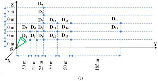 Schemes of field experiments to assess the capabilities of NLOS wireless atmospheric optical communications: (a) experimental series 1 ( = 450 nm, the transmitting system on the UAV and the receiving system on the ground); (b) experimental series 2 ( = 450 nm, the transmitting system on the ground and the receiving system on the UAV); (c) experimental series 3 ( = 510 nm, the transmitting system on the ground and the receiving system on the UAV).