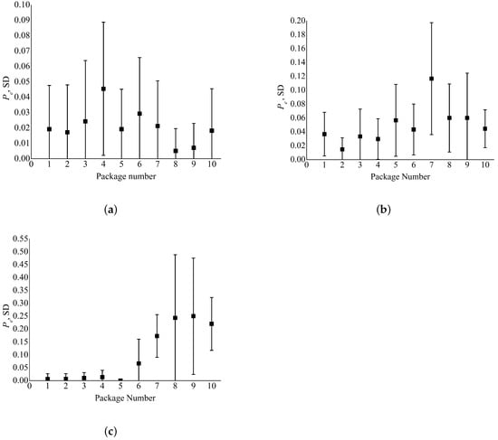 Examples of the obtained SERs and their standard deviations (SDs) for a communication session: (a) experimental series 1, = 100 m, = 20 m; (b) experimental series 2, = 50 m, = 30 m; (c) experimental series 3, = 150 m, = 20 m.