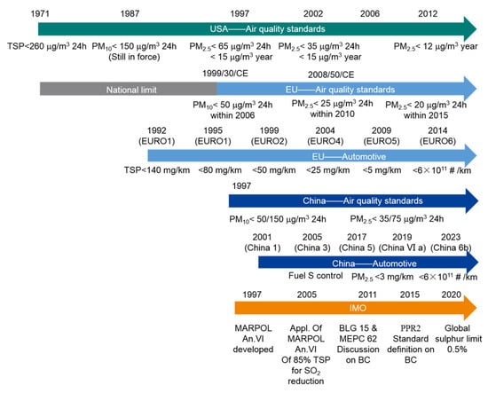 Furthermore, in 2016, the European Parliament and the Council adopted Regulation (EU) 2016/1628 on emission limits and type-approval of internal combustion engines for non-road mobile machinery, which replaces the previous Directive 97/68/EC [22]. These measures to reduce PM emissions will help to a certain extent in some coastal areas. However, these measures and regulations were not applicable to larger marine engines, especially low-speed engines in large ships. However, they contain clear restrictions in terms of sailing areas, engine size, and engine power configuration.