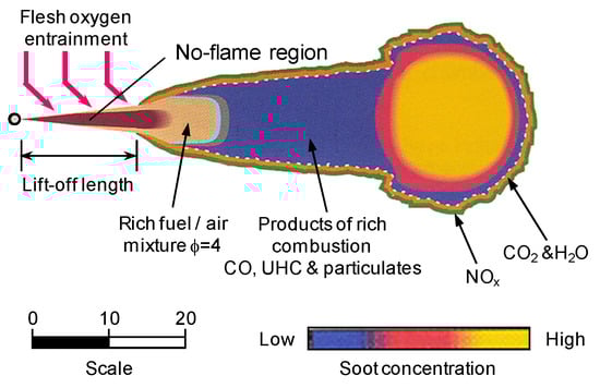- Karataş, A.E.; Gülder, Ö.L. Soot formation in high pressure laminar diffusion flames. Prog. Energy Combust. Sci. 2012, 38, 818–845. [Google Scholar] [CrossRef]