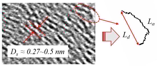 As already mentioned in Section 3.1, BC consists of primary particle agglomerates formed by the pyrolysis kinetics of PAHs. Generally, it is a single-layered graphitization or a combination of several piled-up layers of fragments, as observed by high-resolution Transmission Electron Microscopy (HRTEM). Regardless of the properties of the graphitic fragments, the nanostructure exhibits a high degree of similarity in formation. A typical nanostructure consists of small, orderly, stacked graphite fragments randomly arranged in a hybrid “onion-like” structure [71]. This is influenced by the combustion conditions and the properties of the precursor. In addition, the initial nanostructure of the particles has a marked influence on their oxidation reactivity [72], which significantly affects the regeneration efficiency of particulate filters [73,74]. Ref [74] describes the technology for the mathematical extraction of nanostructure parameters from HRTEM images. In our recent research [70], we have developed our own program using MATLAB 2014b software to measure three typical parameters of primary particles from HRTEM images with relatively high accuracy, as shown in Figure 5.