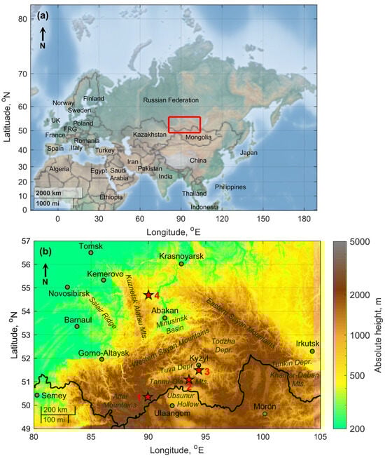 Our research is based on field measurements of atmospheric–electric quantities in July–August 2022 in Southern Siberia (a central part of Eurasia). The region of this study was located in Tyva and Khakassia Republics, Russia (see red box in Figure 1a). The region is characterized by unique physical and geographical conditions.