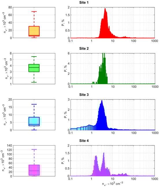 As seen in Figure 2 and Table A1, the average value of n+ at site 1 is 35·103 cm–3 (the median is 6.5·103 cm–3), and its typical range of variability, limited by the interval P25–P75, is (4–30)·103 cm–3. At site 2, the average value of n+ is 3.6·103 cm–3 (the median is 3.7·103 cm–3), and the typical range of variability is (3.0–4.2)·103 cm–3. At site 3, the average value of n+ is 23·103 cm–3 (the median is 3.7·103 cm–3) and, as a rule, varies in the range of (2.7–8.4)·103 cm–3. At site 4, the average value of n+ is 180·103 cm–3 (the median is 25·103 cm–3), and its typical range of variability corresponds to (4.3–51)·103 cm–3.