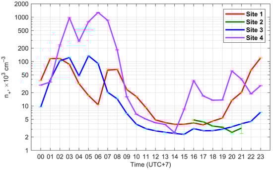 According to Figure 3, the maximum values of n+ during the days are usually observed at night at 23–03 local time (LT), and the minimum—in the daytime at 10–19 LT. At the same time, during sunrise at 04–06 LT and after one at 05–08 LT, the secondary minimum and maximum were observed, respectively. At site 3, the secondary maximum n+ was comparable to the main one, and at site 4, it even exceeded it. In addition, at all observation sites in the afternoon at 15–17 LT and at site 4, as well as in the evening at 19–21 LT, an increase in n+ was noted.