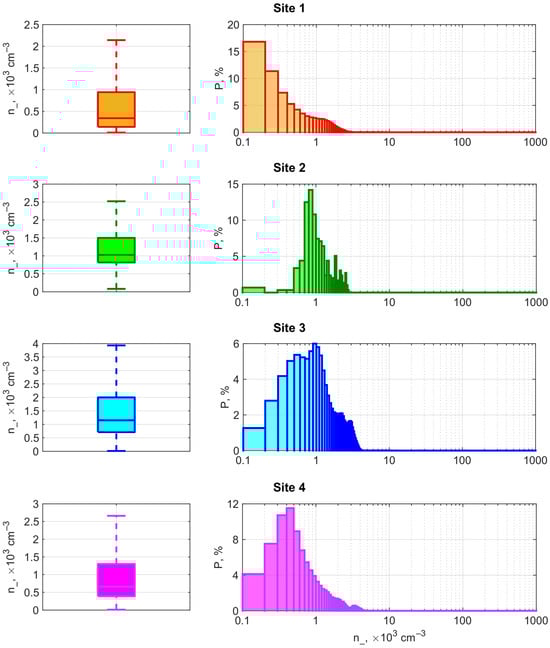 As seen in Figure 4 and Table A2, the average value of n− at site 1 is 0.6·103 cm–3 (the median is 0.3·103 cm–3), and its typical range of variability P25–P75 is limited in (0.1–0.9)·103 cm–3. At site 2, the average n– is 1.2·103 cm–3 (the median is 1.0·103 cm–3), and the typical range of variability is (0.8–1.5)·103 cm–3. At site 3, the average n− is 1.4·103 cm–3 (the median is 1.2·103 cm–3), and as a rule, values vary in the range of (0.7–2.0)·103 cm–3. At site 4, the average value of n− is 1.0·103 cm–3 (the median is 0.7·103 cm–3), and its typical range of variability is (0.4–1.3)·103 cm–3.