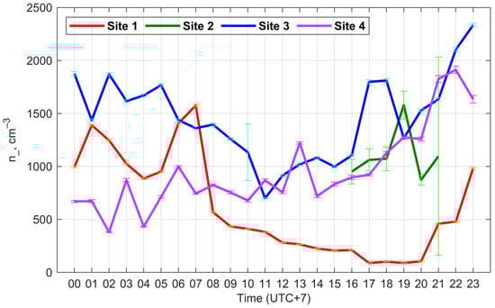 As can be seen in Figure 3, the highest values of n+ were observed at site 4 in the steppe, located close (about 5 km) to salt lakes, which presumably can influence n+. Also, increased values of n+ in the daytime are observed at site 1 in the highlands near the Mongun-Taiga Ridge. In general, there is a similarity in the daily variations in n+ at all observation sites. The Pearson correlation coefficient for sites 3 and 4 is 0.77, and for sites 1 and 3, it is 0.36 (Table A5). The highest values of n− are observed at site 3 in the Tyva depression, and the lowest values—at site 1 in the highlands. As can be seen in Figure 5, daily variations in n− at observation sites are weakly consistent with each other. The correlation for sites 1 and 3 is 0.35, for sites 1 and 4—0.30, and for sites 3 and 4—0.33 (Table A6).