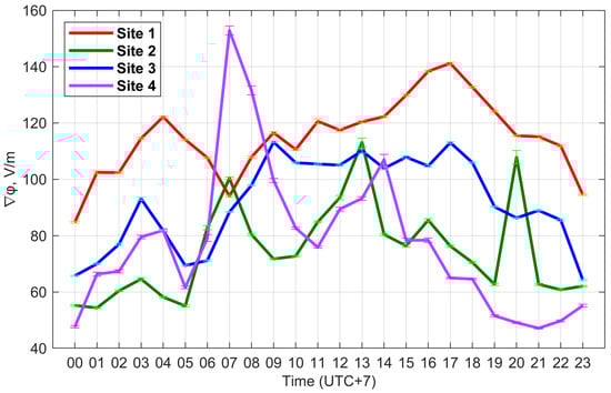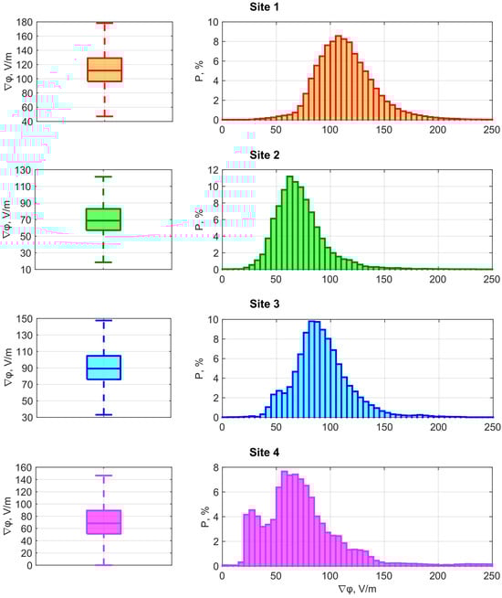 As seen in Figure 6 and Table A3, the average value of ∇φ at site 1 is 120 V/m (the median is 110 V/m), and its typical range of variability limited by the interval P25–P75 is 100–130 V/m. At site 2, the average ∇φ is equal to 75 V/m (the median is 69 V/m), and the typical range of variability is 60–80 V/m. At site 3, the average value of ∇φ is 92 V/m (the median is 89 V/m), and, as a rule, one varies in the range of 80–110 V/m. At site 4, the average value of ∇φ is 77 V/m (the median is 68 V/m), and its typical range of variability corresponds to 50–90 V/m.