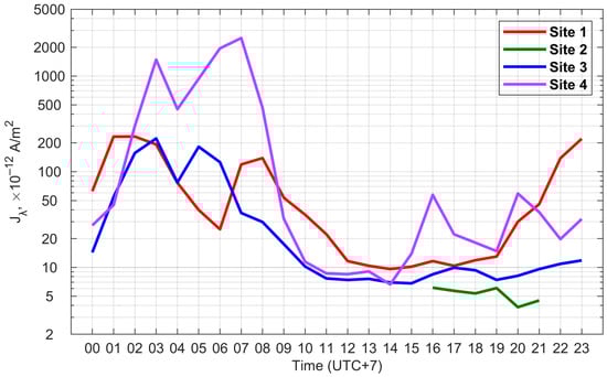 According to Figure 8, the daily variation in Jλ at observation sites, in general, resembles the daily variation in n+. The maximum values of Jλ are observed at night at 23–03 LT, and the minimum values are observed during the day at 10–19 LT. During sunrise at 04–06 LT and after sunrise at 05–08 LT, secondary minimum and maximum are observed, respectively. Moreover, at site 4, the secondary maximum Jλ exceeded the main maximum both in amplitude and duration. The increase in Jλ at site 4 in the afternoon at 15–17 LT and in the evening at 20–21 LT was also observed.