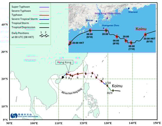 Provisional best track of Severe Typhoon Koinu and (insert) its track near Hong Kong (Hong Kong Time (HKT) = UTC + 8 h). The movement of Koinu was slow and erratic during 6–8 October 2023.