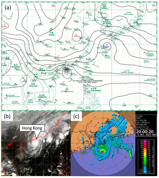 (a) Surface weather chart at 1200 UTC on 8 October 2023 as analyzed by the Hong Kong Observatory (HKO), where Koinu was at its closest to Hong Kong. Koinu had a small circulation, and the northeast monsoon dominated over Southern China. (b) Infrared satellite image of Himawari-9 Satellite of the Japan Meteorological Agency at 1200 UTC on 8 October 2023 showing Koinu just to the south of Hong Kong. (c) HKO radar image at 1200 UTC on 8 October 2023. Koinu had a compact eye, estimated to be less than about 30 km in diameter.