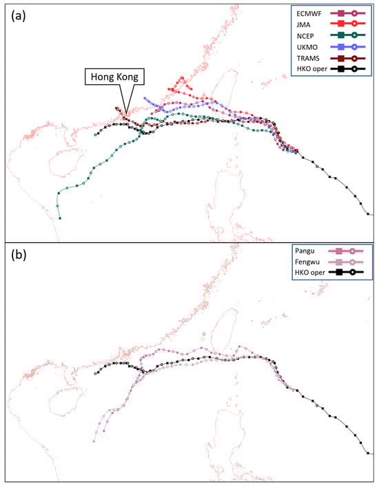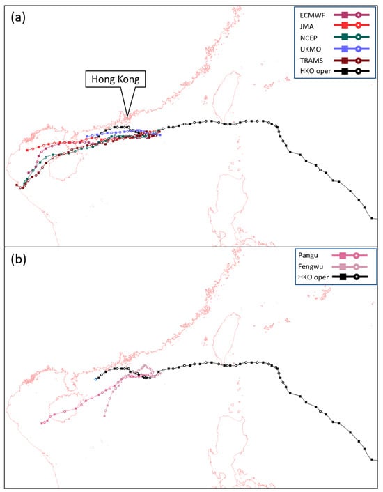 Models’ forecast tracks of Koinu at 1200 UTC run on 6 October 2023. Also shown on each panel is Koinu’s analysis positions (black) based on HKO operational analysis track. (a) Forecast tracks from ECMWF, JMA, NCEP, UKMO, and TRAMS. (b) Forecast tracks from AI models Pangu-Weather and Fengwu; both were initialized by the operational analysis of ECMWF.