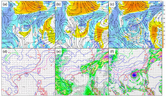 ECMWF’s operational analysis of (a) 700 hPa relative humidity (color-filled contours) and winds (barbs and streamlines), as well as (d) mean seal-level pressure (contours) at 1200 UTC on 8 October 2023. Note that according to the HKO operational analysis, Koinu was at that time still a typhoon with central pressure 975 hPa and maximum sustained winds 75 kt. (b,e) 96 h forecast of ECMWF valid for 12 UTC, 8 October 2023, where Koinu was forecast to be dissipating possibly due to significant dry intrusion from the northeast monsoon, while its remaining surface vortex would have been pushed southwestwards by the monsoon. (c,f) 96 h forecast of TRAMS valid for the same time. TRAMS successfully forecast Koinu to remain as an intense and intact tropical cyclone at its closest to Hong Kong.