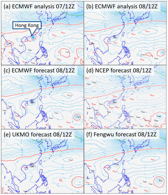 Another point of interest in the steering flow for Koinu is depicted in the 500 hPa geopotential height (Figure 6). The ECMWF operational analysis showed that a ridge axis was built to the southeast of Koinu on 8 October (e.g., the evolution of the 5910 m geopotential height contour in Figure 6a,b). It can be seen on Figure 6c,d,e that the various conventional models could not forecast the establishment of such a ridge to the right extent or strength. Possibly due to the underestimated intensity of Koinu and low-level northeasterlies brought by the monsoon, the models generally maintained a continual westward movement of the cyclone. On the other hand, Fengwu forecast a slight ridging flow (Figure 6f), and thus possibly the northwest movement of Koinu in the direction of Hong Kong (Figure 4b).