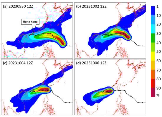 EPS strike probability maps of Koinu based on the ensembles of ECMWF, NCEP, and UKMO from 1200 UTC runs on (a) 30 September and (b) 2, (c) 4, and (d) 6 October 2023. Also shown is Koinu’s analysis positions (black) based on HKO operational analysis track.