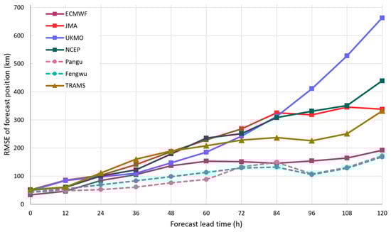 Root-mean-square error of models’ forecast positions for Koinu as a function of lead time. Forecasts are verified against Koinu’s analysis positions based on HKO operational analysis track and have a common dataset among different models.
