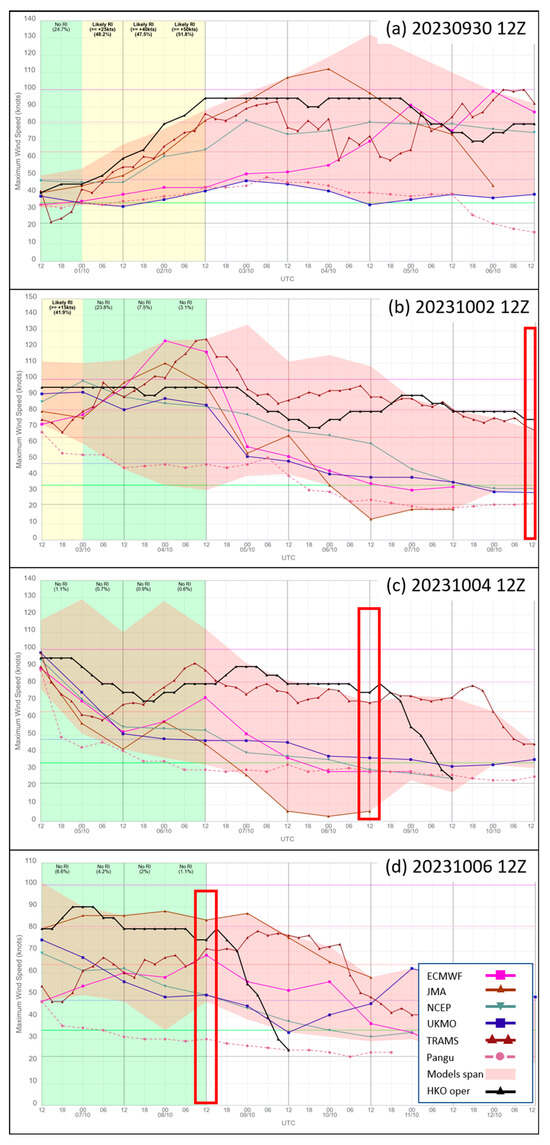Intensity of Koinu as forecast by models from 1200 UTC runs on (a) 30 September and (b) 2, (c) 4, and (d) 6 October 2023. The light-red shading indicates the spread of all available models. Also shown is Koinu’s analysis intensity (black line) based on HKO operational analysis track. The red rectangle indicates the time period where Koinu at its closest approach to Hong Kong.