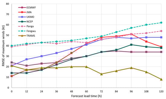 Root-mean-square error of models’ forecast sustained maximum winds for Koinu as a function of lead time. Forecasts are verified against Koinu’s analysis intensity (in knots) based on HKO operational analysis track and have a common dataset among models.