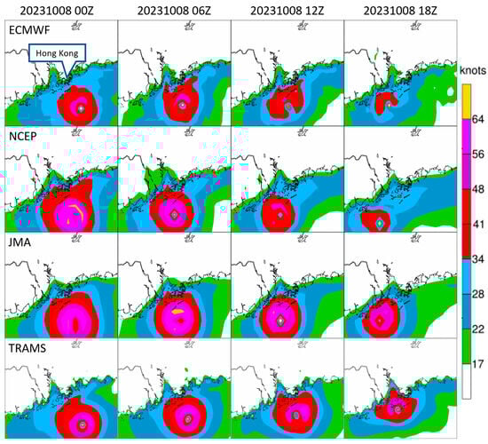 A detailed discussion of the winds in Hong Kong under the influence of Koinu can be found in He et al.’s study [3]. In summary, gale-force winds were prevailing over the southern part of Hong Kong, and hurricane-force winds higher than 100 kt (10 min mean winds) were registered at Huangmao Zhou (Figure 1 insert), an island of about 50 km south of the territory [8]. It can be seen that, for ECMWF and NCEP, the wind force was forecast to be rather weak, and Koinu was expected to weaken much faster than the actual observations. Similar to the case of Saola [2], JMA appeared to be the best forecast of the wind structure of Koinu, as its forecast wind distribution is generally consistent with the actual observations. TRAMS also under-forecast the wind strength slightly; nevertheless, winds up to 64 knots (storm force wind, in magenta in Figure 11) are expected to be rather close to the southwestern part of Hong Kong. In view of this model guidance, and together with the track and intensity forecast of Koinu in this case, consideration has been made on the possibility of near-hurricane-force wind or maybe even hurricane-force wind near Hong Kong, which is one basis for the issuance of tropical cyclone warning signal No. 9 in Hong Kong.