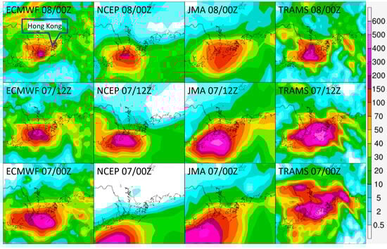 Models’ 24 h accumulated rainfall forecast for 9 October 2023, with three consecutive runs showed on the top (initialization time 20231008 00Z), middle (initialization time 20231007 12Z), and bottom rows (initialization time 20231007 00Z). The four columns starting from the left are, respectively, ECMWF, NCEP, JMA, and TRAMS model output. TRAMS was able to predict the most accurate magnitude of local rainfall on 9 October 2023 following the passage of Koinu, but its most recent run (on top row) oppositely turned down the rainfall forecast; such a wrong trend was also given by other global models.