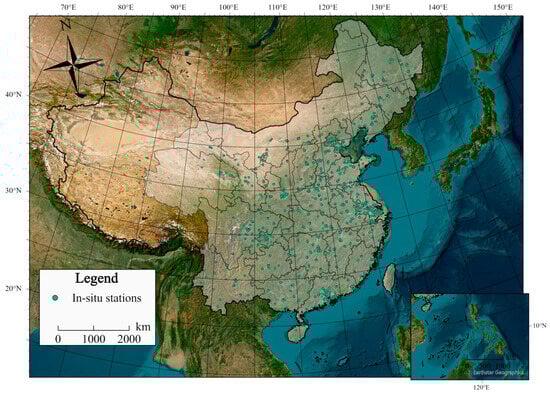 China is situated in eastern Asia on the west coast of the Pacific Ocean, with latitudes extending from 4° N to 53° N and longitudes from 73° E to 135° E. China has a land area of 9.6 million km2 and a complex topography, which is characterized by a topography of high in the west and low in the east, with mountainous terrain dominating the west and plains and hills dominating the east. The topography of China decreases in a sequence of one, two, and three steps from the Tibetan Plateau to the north and east. Since the full-disk scanning area of the Himawari-8 satellite is 80° E–160° W, 60° S–60° N [], it unable to thoroughly cover the Xinjiang Autonomous Region and Tibet Autonomous Region, so these two provinces were excluded from the study area. In recent years, China has made significant efforts to address environmental pollution issues, including the establishment of a network of in situ stations to monitor air pollutants such as ground-level trace gases. We selected the 1935 in situ stations that covered the study area by 2021 (see Figure 1). These stations are primarily concentrated in densely populated areas such as provincial capitals and central cities, and there are not enough monitoring stations in suburban counties and townships.