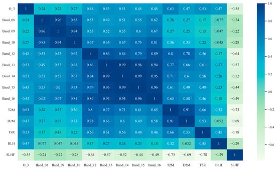 Evaluating and selecting features is crucial for maximizing the performance of a model and improving the accuracy of predictions. In order to ascertain the positive contribution of the selected features to the models, we evaluate them from two different perspectives. One way we analyzed the relationship between the features and the target variable was by calculating the Pearson correlation coefficients (PCCs), as shown in Figure 2. The PCC figure clearly demonstrates the strong correlation between the meteorological parameters, including the T2M, BLH, TSR, and BT data from band 12 and band 13, and ground-level O3 concentrations.